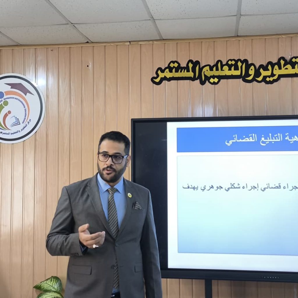 تطرقت الدورة إلى قانون التبليغات القضائية بوصفه أحد الأسس المهمة في ضمان سير الإجراءات القانونية بشكل صحيح، حيث جرى توضيح آليات التبليغ وأنواعه ومتطلبات صحة الإجراءات. كما تناولت الدورة التبليغ الشخصي بوصفه الوسيلة الأهم لضمان وصول الإشعار إلى المعني مباشرة، مع بيان شروطه القانونية وأبرز الأخطاء التي ينبغي تجنبها أثناء تطبيقه.