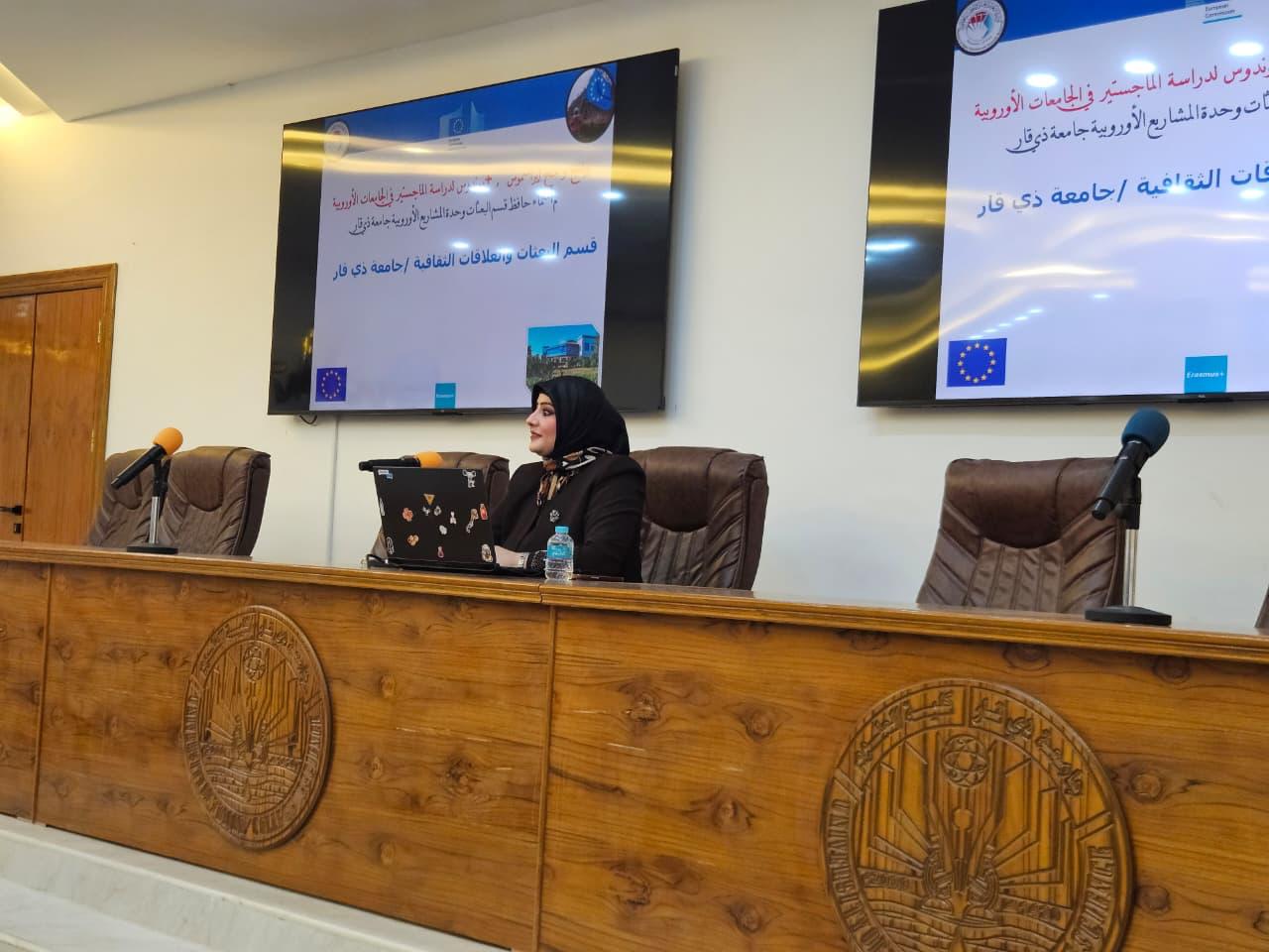 في إطار مساعي جامعة ذي قار لتعزيز الانفتاح الأكاديمي الدولي وتطوير المهارات اللغوية للباحثين والأكاديميين، أقام قسم البعثات والعلاقات الثقافية بالتعاون مع مركز التعليم المستمر ورشة عمل تخصصية بعنوان (برنامج ومنح إيراسموس + للدراسات العليا في الجامعات الاوربية) في كلية العلوم/ جامعتنا وبحضور نخبة من التدريسيين والباحثين.
