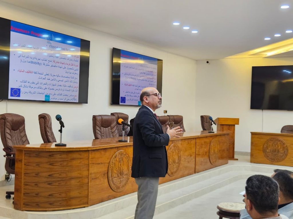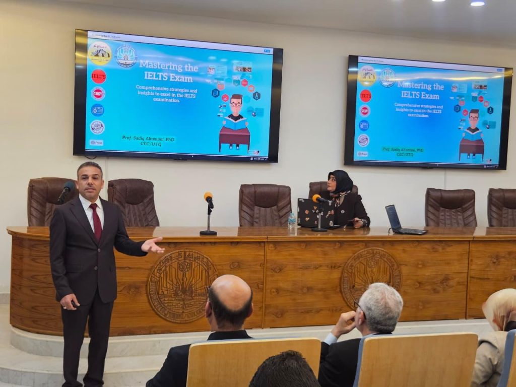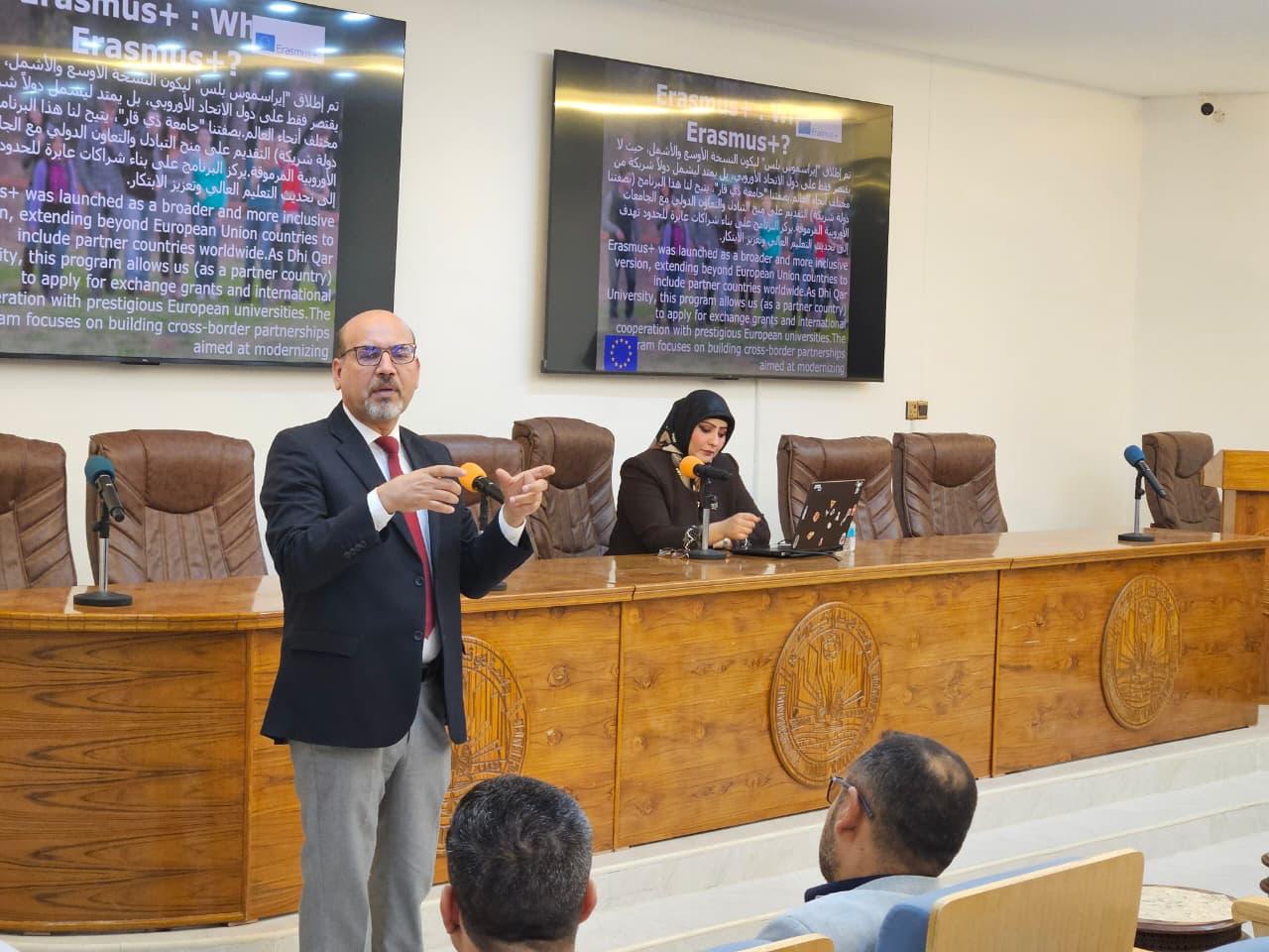 نحو آفاق أكاديمية عالمية: جامعة ذي قار تنظم ورشة عمل تعريفية حول برنامج البعثات الدراسية “إيراسموس+” واستراتيجيات اجتياز اختبار الـ “IELTS”