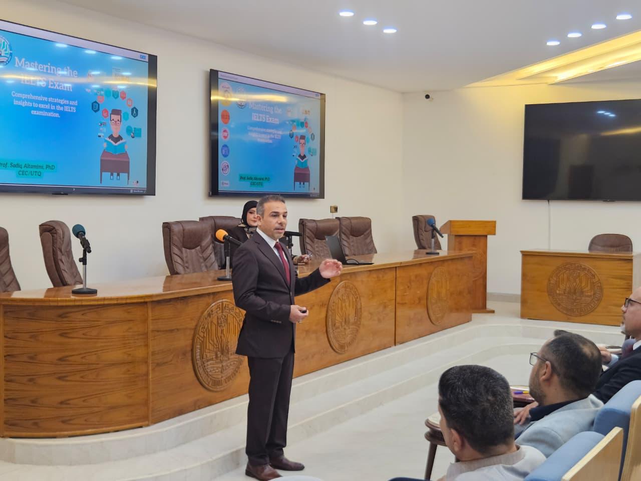 وفي المحور الثاني، قدّم السيد (أ.د. صادق التميمي) مدير مركز التعليم المستمر، تفصيل شامل حول اختبار الـ (IELTS) بوصفه معياراً دولياً لإثبات الكفاءة اللغوية، موضحاً أن الاختبار لا يقتصر على قياس اللغة فحسب، بل يختبر المهارات الأربع الأساسية (الاستماع، والقراءة، والكتابة، والمحادثة) بدقة. وأكد التميمي على أهمية استراتيجيات إدارة الوقت بفاعلية والتدريب التراكمي لتطوير الحصيلة اللغوية التخصصية التي يحتاجها الباحث في مجاله العلمي، مع التشديد على ضرورة الاستعانة بالمصادر والمواد التعليمية المعتمدة دولياً لضمان التحضير الأمثل والوصول إلى الدرجة المطلوبة.